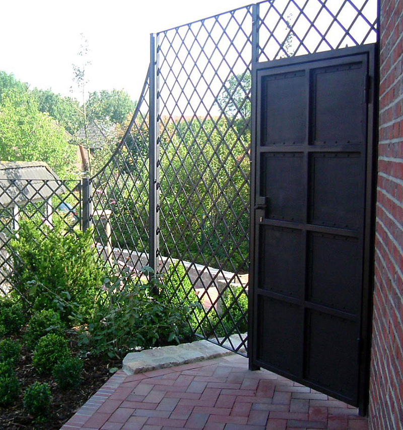 GeländerFiligrane Schmiedearbeit mit traditionellen Verbindungen. Eisen geölt. Das gleiche Geländer steht auch auf der Terrasse. |